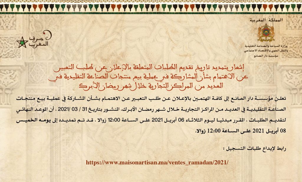 إشعار بتمديد تاريخ تقديم الطلبات المتعلقة بالإعلان عن طلب التعبير عن الاهتمام بشأن المشاركة في عملية بيع منتجات الصناعة التقليدية في العديد من المراكز التجارية خلال شهر رمضان الأبرك