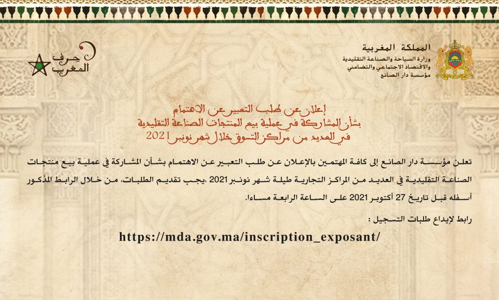 إعلان عن طلب التعبير عن الاهتمام بشأن المشاركة في عملية بيع المنتجات الصناعة التقليدية في العديد من مراكز التسوق خلال شهر نونبر 2021